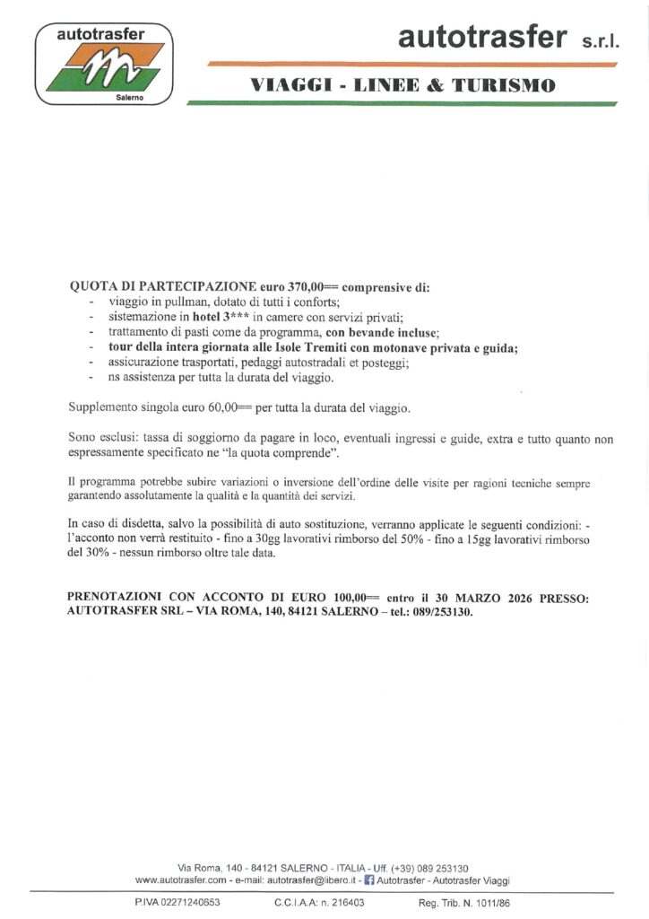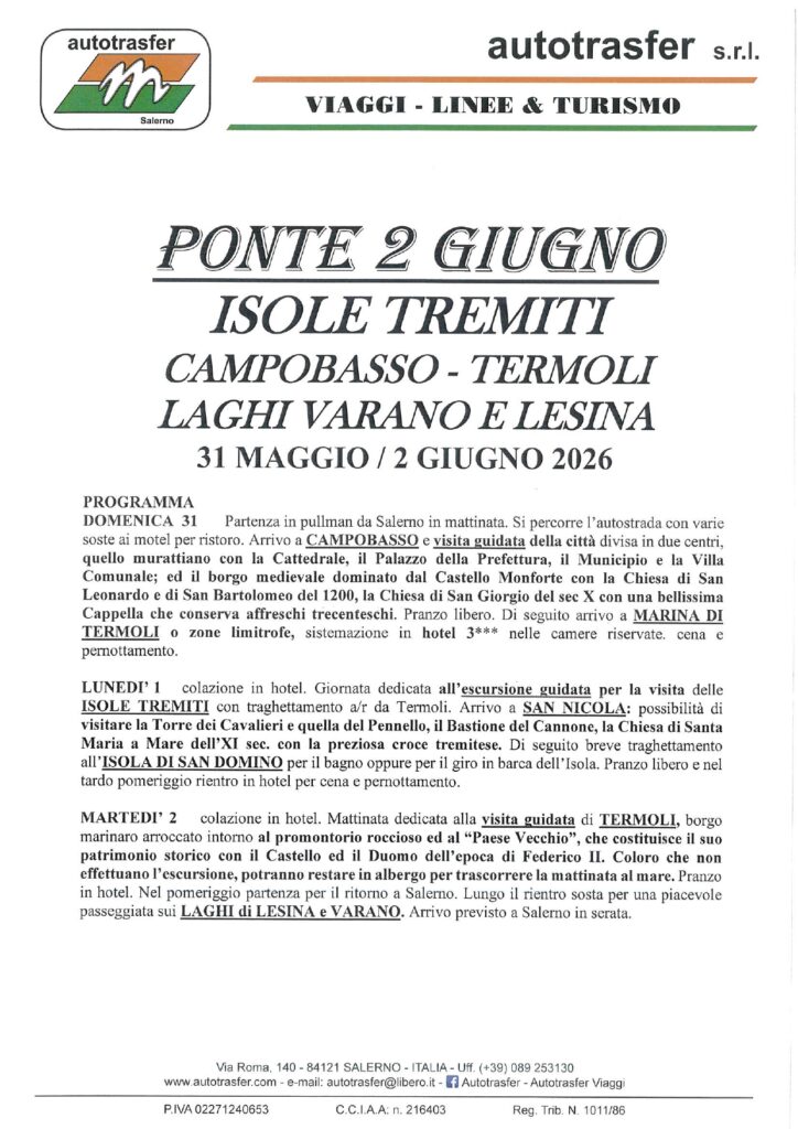 PONTE DUE GIUGNO 2026 Posted on 4 Marzo 2026 by Marta Bove ISOLE TREMITI TERMOLI – CAMPOBASSO – LAGO DI VARANO E LESINA 31 MAGGIO / 2 GIUGNO 2026 3 GIORNI / 2 NOTTI